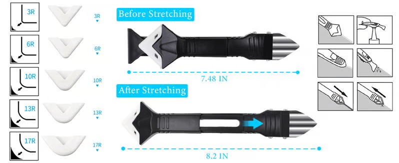 Interchangeable Silicone Heads: Features a slip-resistant button and comes with 5 radius caps (3/6/10/13/17mm). These allow you to achieve perfect results on inside/outside corners, curves, and flat joints, adapting to various project requirements.