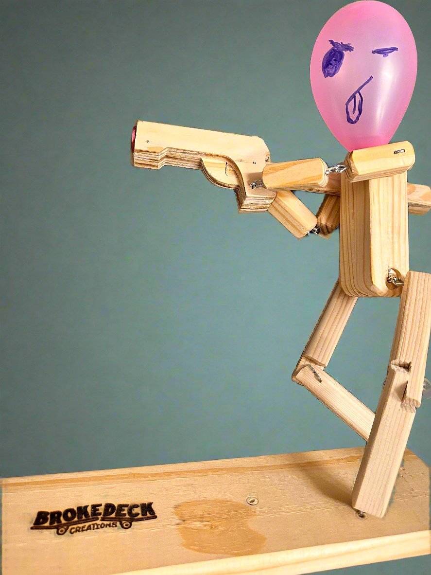 Where strategy and precision collide! These handcrafted mechanical figures are equipped with wooden guns that shoot tethered wooden bullets tipped with sharp metal points, designed to pop the opponent’s balloon head in an intense battle. Each bot features a unique loading mechanism that pulls the string back into the chamber, readying the next shot for rapid-fire action.