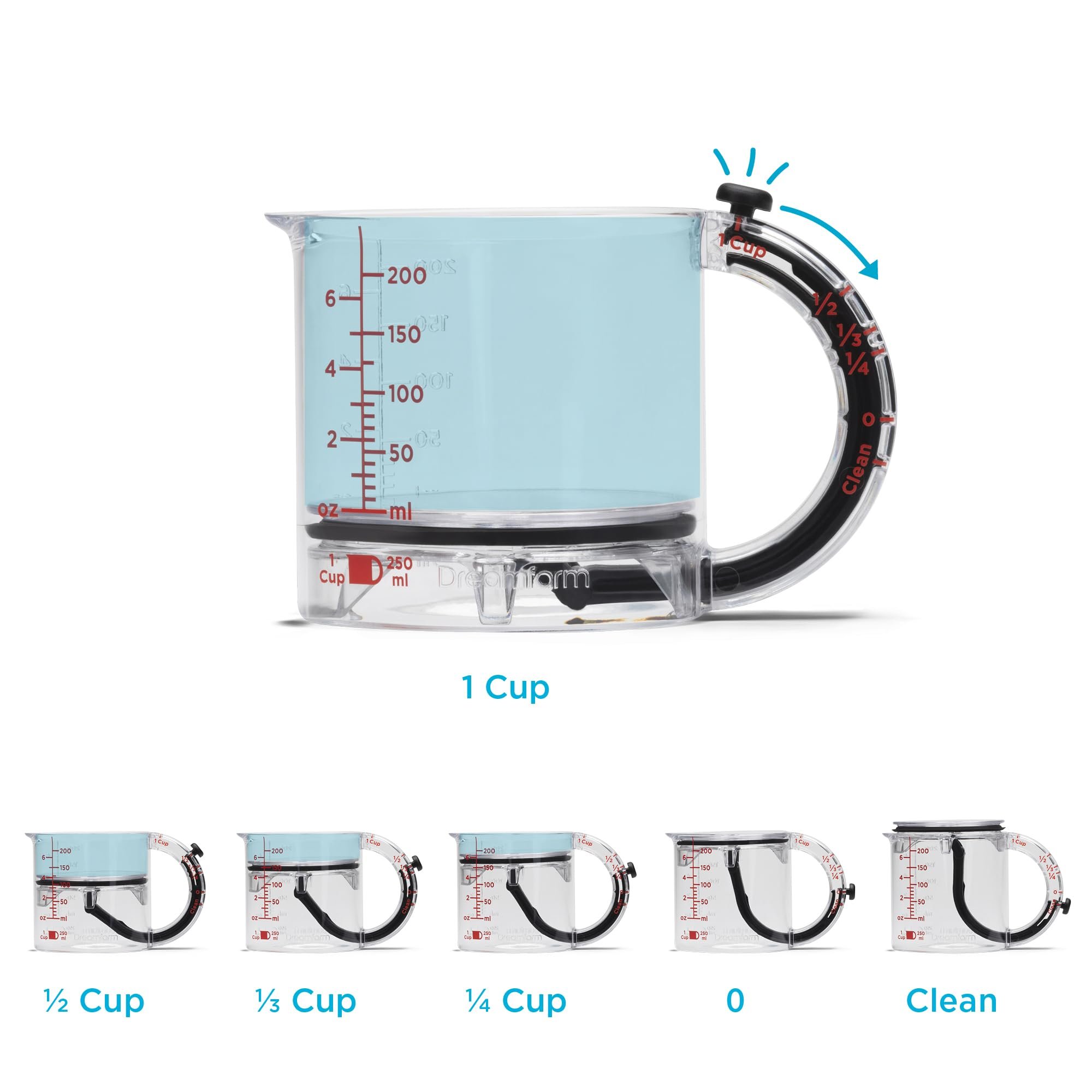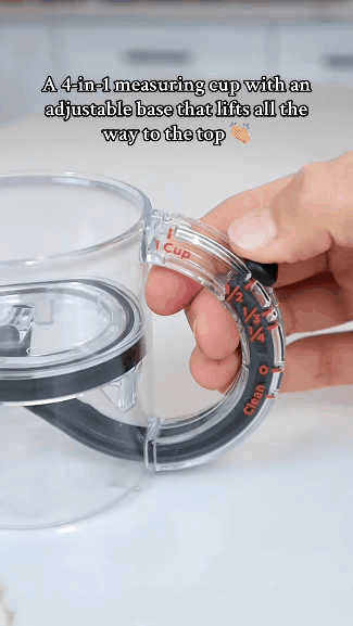 Upcup’s adjustable base raises to create 250ml (1 cup), 1/2 cup, 1/3 cup, and 1/4 cup measurements, all in a single cup